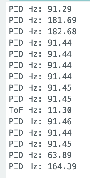 In the same manner I calculated the time difference between consecutive PID and ToF sampling to find their respective sampling rates. While the ToF sampling rate is still close to 10 Hz, the PID sampling rate is now close to 90 Hz and sometimes even 160 Hz. This is an increase of 9 to 16 times, providing much more responsive PID control. With a higher sampling rate the PID array sizes were increased to 500 to account for a total of about 5 seconds of data.
