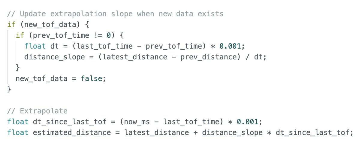 Now to increase the sampling rate of the controller, the PID function will extrapolate using linear predictions and linear rates of change the predicted next distance. Now PID will update each cycle without stalling to wait for a new ToF distance value. When new data does in fact come in, the new linear rate of change is calculated to predict the next distance point yet again.