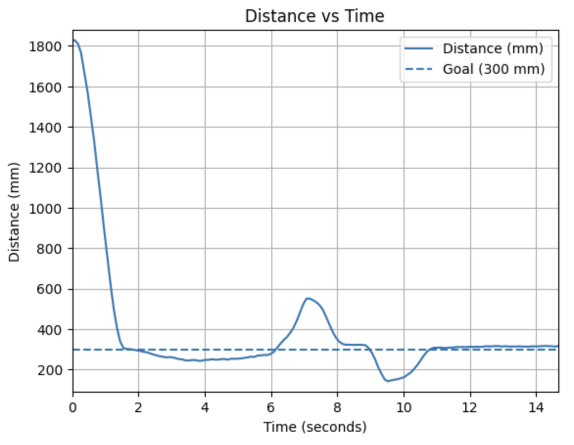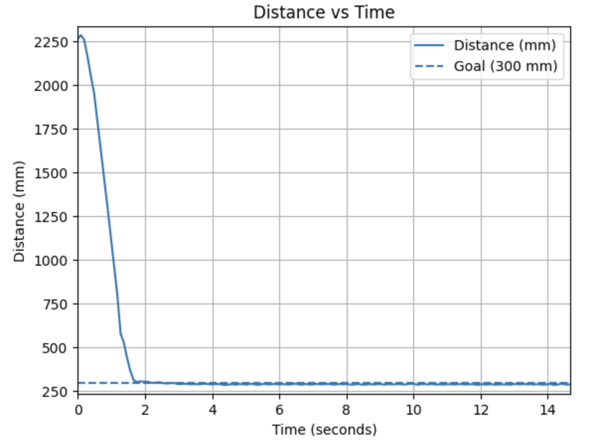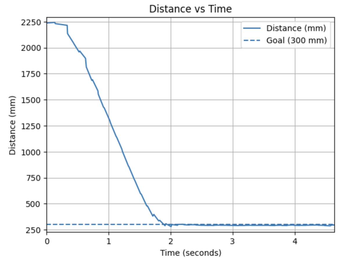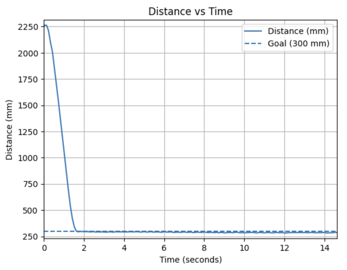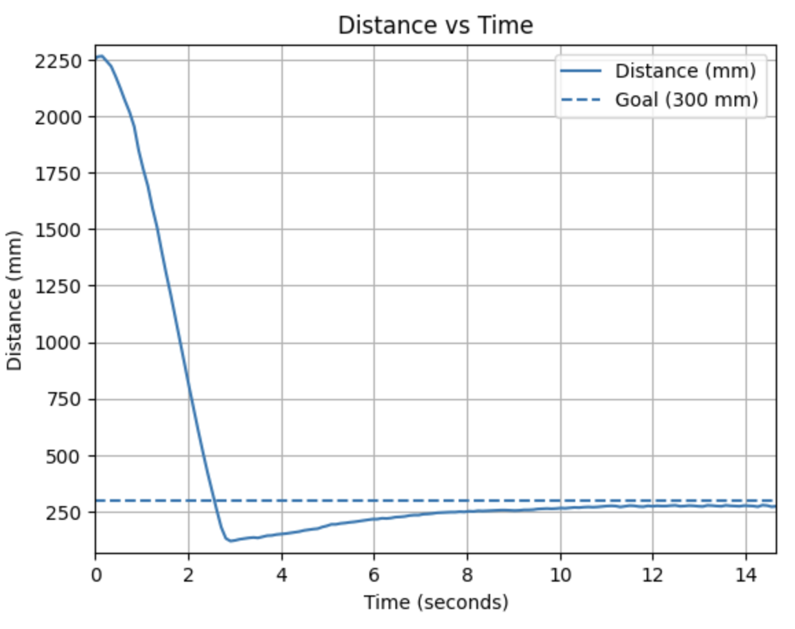 The goal of this lab was to implement a closed-loop controller that drives the robot toward a wall and stops at exactly 304 mm (1 ft), using feedback from a Time-of-Flight (ToF) sensor. The controller must be robust to different starting distances (2–4 m) and external perturbations, while avoiding overshoot that would cause a crash.