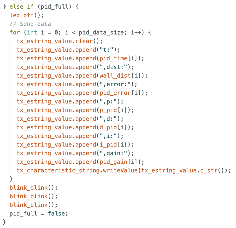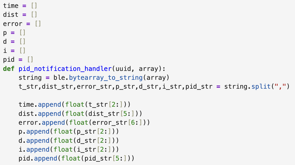 This data is then read on the Artemis Nano and internal global variables are updated respectively. Each gain and the target distance are given values alongside proper data flag setup for PID collection to start at index 0 of its arrays, before filling up and sending the data.