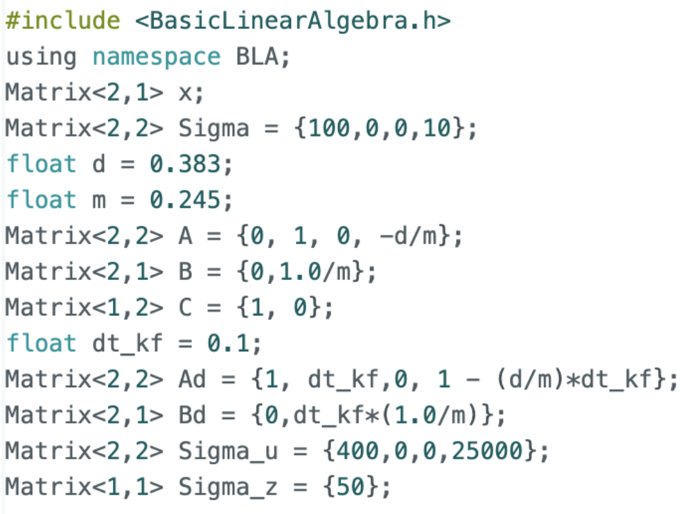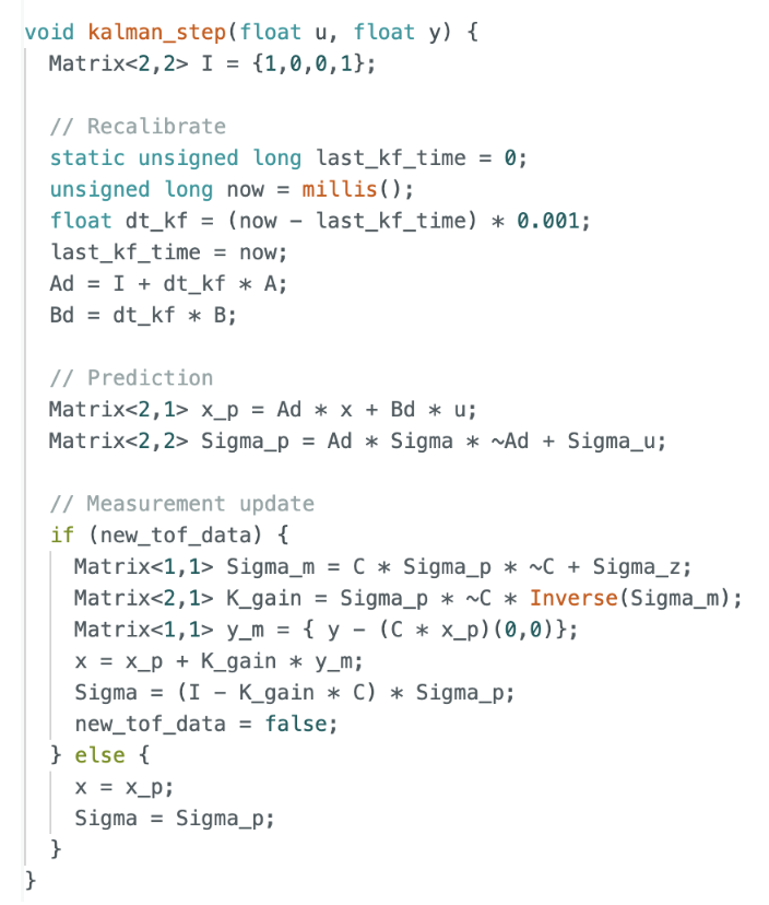 One critical improvement in the onboard implementation was dynamically computing the timestep dt at each iteration. This was necessary because the control loop does not run at a fixed frequency, and using a constant timestep resulted in poor predictions. The Kalman Filter was structured to perform prediction at every loop iteration and only perform a measurement update when new ToF data was available. This allowed the filter to provide high-frequency state estimates even though the sensor updates were relatively slow.