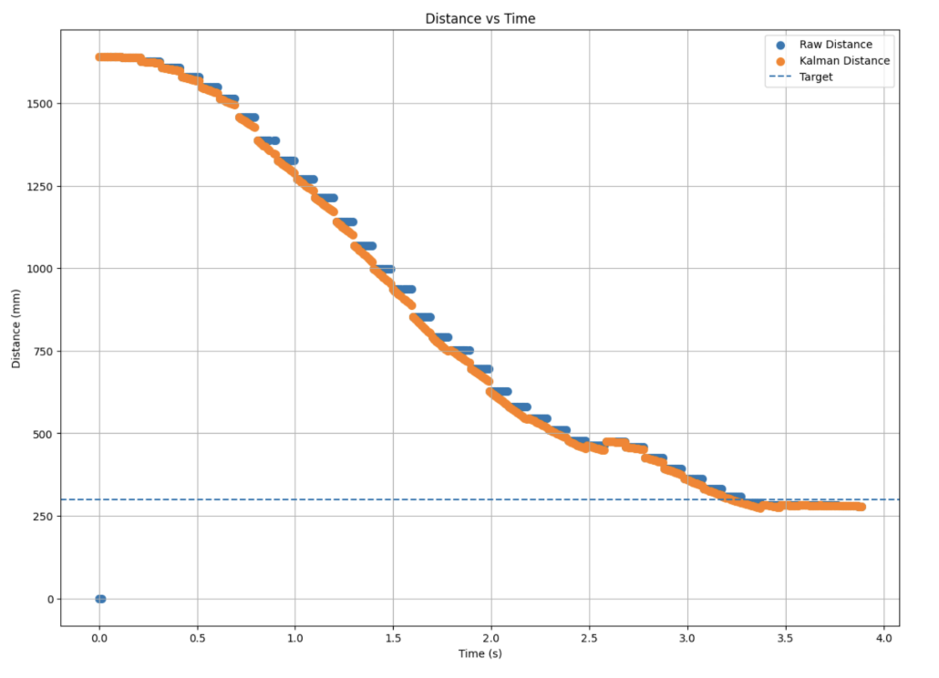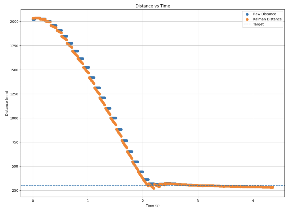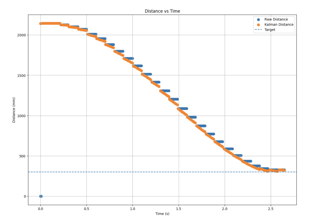 The estimated distance directly from the prediction step of the Kalman Filter replaced the linearly extrapolated distance previously used in the PID controller: