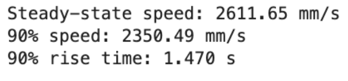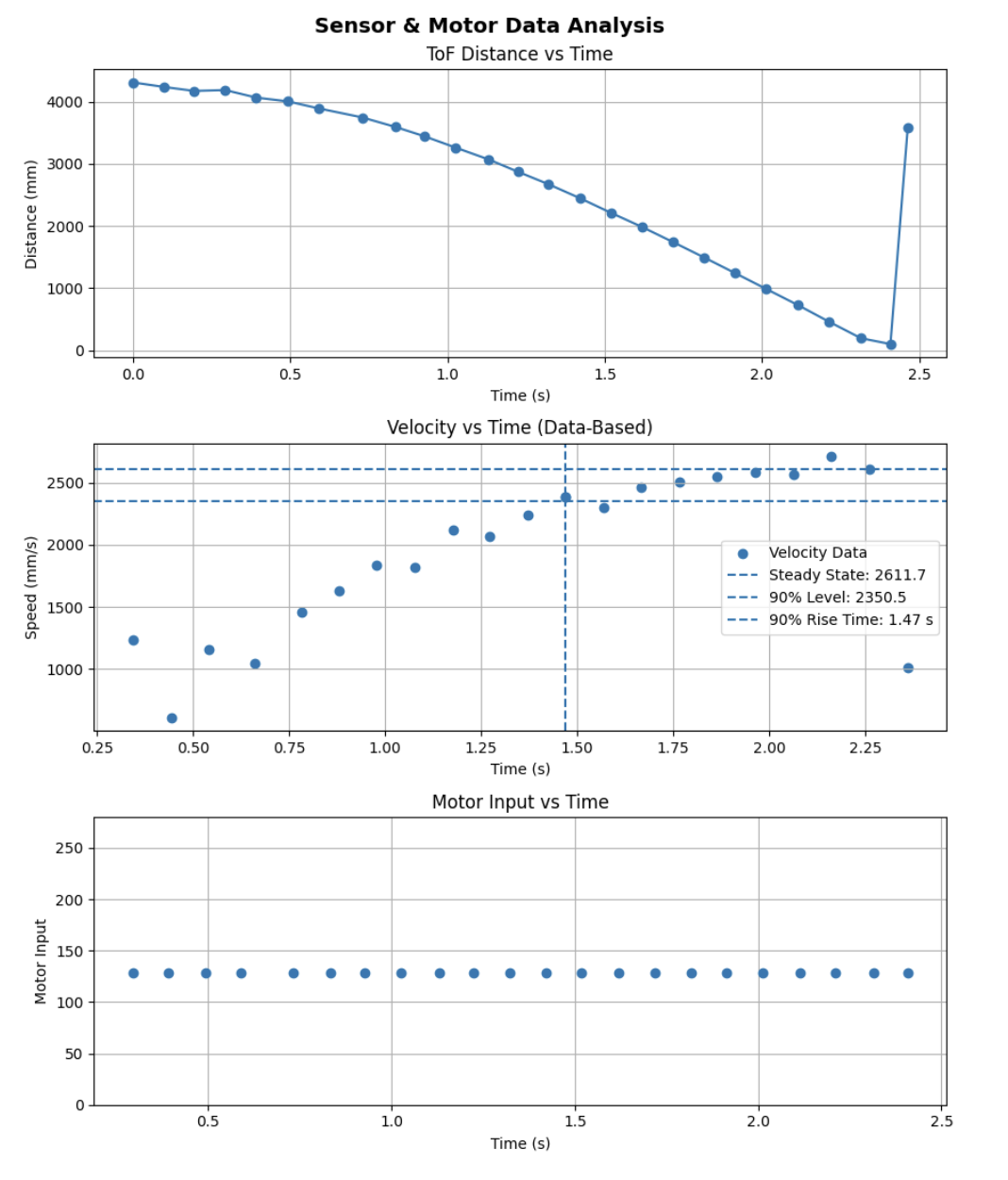 To determine the parameters d for drag and m for mass, a step response was performed by driving the robot toward a wall at a constant motor input (128). ToF distance measurements were recorded and converted into velocity by taking finite differences over sensor readings. From this data, the steady-state velocity and approximate rise time were extracted using python scripts. Several motor inputs were tested from 50% 75% 90% and 100%. Nearly all of them refused to settle close to a steady state, except 50% at the furthest distance and no braking. Thus, I chose to use this step input (128) and data was exported using a typical bluetooth notification handler.