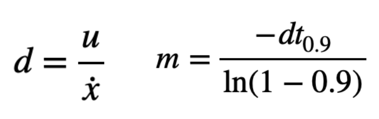 With these values, drag was estimated from the ratio of input to steady-state velocity, and mass was computed using the rise-time relationship derived from the first-order system approximation.