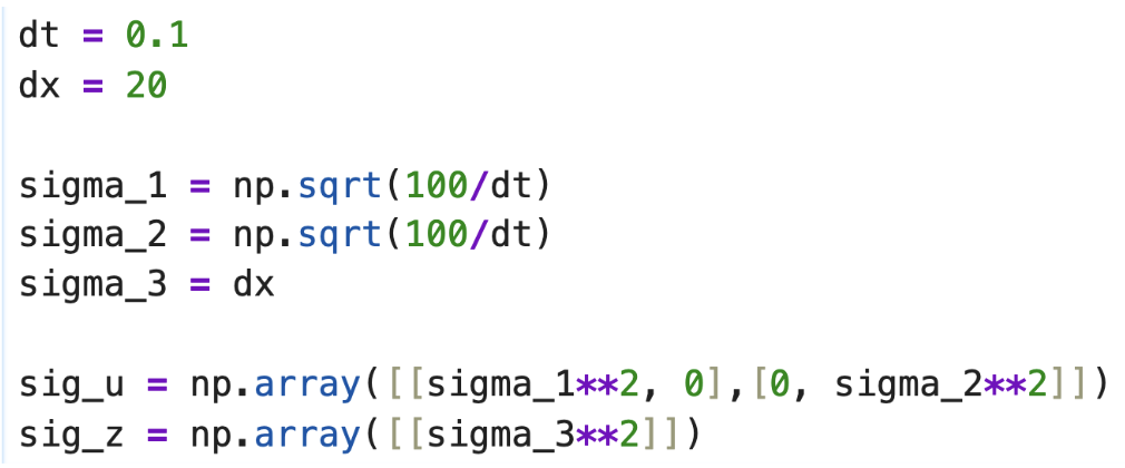 The Kalman Filter also requires defining process noise and measurement noise covariance matrices, which determine how much the filter trusts the model versus the sensor. In this implementation, the process and measurement noise matrix was initialized as: