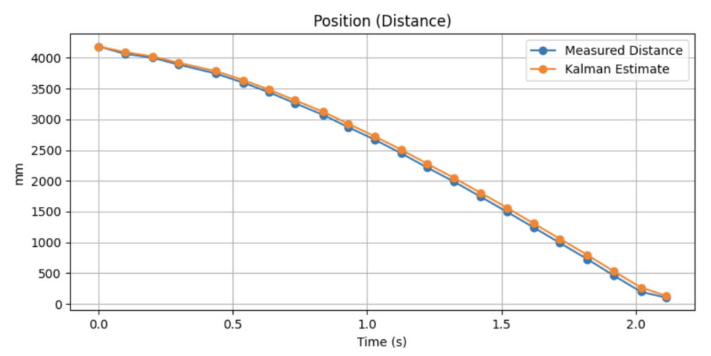 The Kalman Filter was first implemented and tested in Python using recorded data from my step response. The simulation demonstrated that the filter successfully smoothed noisy ToF data while maintaining accurate tracking of the system’s motion. It also provided a velocity estimate, which is not directly measured by the sensor. By adjusting the covariance matrices, the balance between smoothness and responsiveness could be controlled. If the model was trusted too much, the estimate became smooth but lagged behind the true position. If the measurements were trusted too much, the estimate became noisy but highly responsive, nearly choppy.